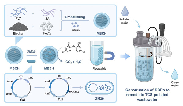 Synthetic biology provides an effective approach for emerging contaminant degradation, but biosafety and stability challenges limit its practical use. Here, we engineered Pseudomonas knackmussii ZM30 for efficient triclosan (TCS) degradation, incorporating the hok/sok system to ensure plasmid stability without antibiotics. To enhance applicability, we developed MBEH: a magnetic biochar-based engineered bacteria composite in hydrogel. MBEH synergistically adsorbs TCS (via biochar) and degrades it (via ZM30), reducing secondary pollution. In sequencing batch reactors, MBEH achieved stable TCS removal with minimal disruption to activated sludge microbiota. No ZM30 was detected in effluent, confirming its biosafety. MBEH exhibited 80.52% recovery from sludge and 1.98 × 106colony-forming units (CFU)/g bacterial viability after 40 days of operation, ~95% of the initial level. This strain–material hybrid combines targeted degradation with environmental resilience, offering a scalable strategy for TCS bioremediation. The design principle is adaptable to other pollutants, bridging synthetic biology and practical environmental applications.