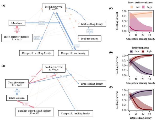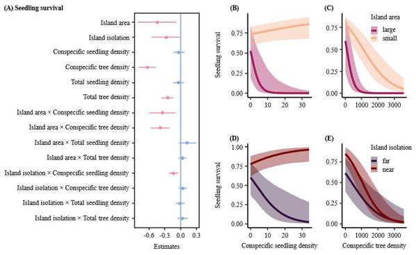 Increasing densities of conspecific trees and seedlings reduced seedling survival more on larger and more isolated islands. These processes were linked to increases in insect herbivore richness on larger islands, and less fertile soils on more isolated islands.