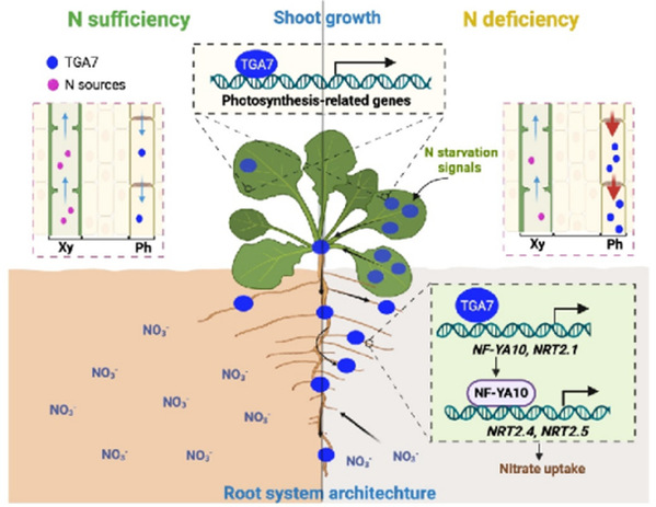 Long-distance regulation between individual organs is a fundamental process for the optimized adaptation of the plant body to diverse environments. However, systematic methods for identifying key genes for long-distance regulation are currently unavailable. Here we present a new approach, trans-organ analysis of gene co-expression networks, which offers a unique way of identifying candidates for such genes. This approach revealed that TGA7 functions as a shoot-to-root mobile bZIP transcription factor in Arabidopsis to activate photosynthetic genes directly in shoots and nitrate-uptake-related genes, both directly and via a transcriptional cascade, in roots. Analysis of grafted chimeras showed that nitrogen-deficiency-induced enhanced TGA7 expression in shoot vascular tissue promotes TGA7 protein accumulation in roots, boosting root growth and nitrate uptake. Furthermore, the loss of TGA7-mediated long-distance regulation perturbed the balance between shoot and root development under nitrogen deficiency. These findings underscore the utility of our approach for uncovering long-distance regulation in plants.