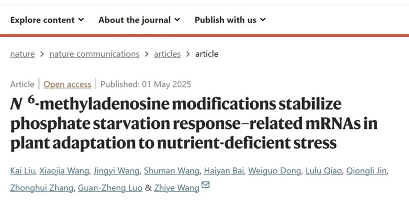 Phosphorus (P) is an essential macronutrient for plant growth. However, the availability of inorganic phosphate (Pi) in soils is generally low, and Pi is readily immobilized, leading to frequent phosphorus deficiency in plants during their growth. In-depth research on the mechanisms of plant responses to phosphate starvation, and improving phosphorus uptake and utilization efficiency, are of great significance for achieving sustainable agricultural development. The research group of Zhiye Wang at the College of Life Sciences, Zhejiang University has long been dedicated to studying plant nutrient stress resistance mechanisms at the level of RNA metabolism. N⁶-methyladenosine (m⁶A) is the most abundant internal modification in eukaryotic mRNA and plays important roles in post-transcriptional regulation and translation. Previous studies have indicated that m⁶A serves important regulatory functions in plant responses to various stresses. However, the molecular mechanisms by which m⁶A participates in regulating plant responses to phosphate starvation remain unclear.