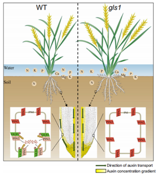 Ideal root system architecture (RSA) is important for efficient nutrient uptake and high yield in crops. We cloned and characterized a key RSA regulatory gene, GRAVITROPISM LOSS 1 (OsGLS1), in rice (Oryza sativa L.). The gls1 mutant displays an increased root growth angle, longer primary roots, more adventitious roots and greater nutrient uptake efficiency and grain yield in paddy fields. OsGLS1 is strongly expressed in the root tips of seedlings and in leaves at the flowering stage. OsGLS1 encodes a RING finger E3 ubiquitin ligase mainly localizing at the basal plasma membrane (PM) in several root cell types when phosphorylated on its Ser-30 residue. OsGLS1 interacts with, ubiquitinates and promotes the degradation of basally localized PIN-FORMED 2 (OsPIN2) via the 26S proteasome, thus establishing the typical apical PM localization of OsPIN2 and polar auxin transport, ultimately shaping RSA. This previously unidentified OsGLS1-OsPIN2 regulatory pathway will contribute to an optimal RSA for enhancing nutrient efficiency in rice and other crops.