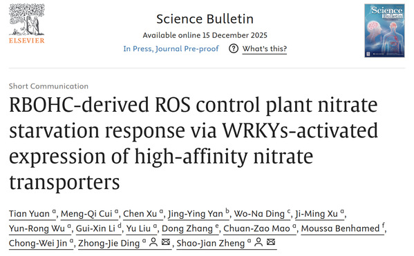 Title:RBOHC-derived ROS control plant nitrate starvation response via WRKYs-activated expression of high-affinity nitrate transporters
