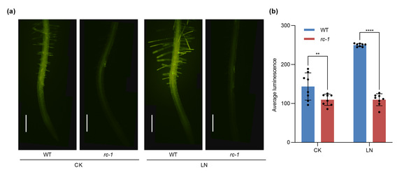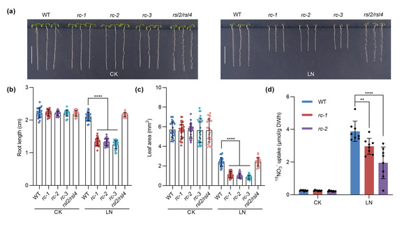 The research team discovered through systematic genetic screening that the loss-of-function mutant of the RBOHC gene in Arabidopsis (rbohc, rc-1) exhibits growth-inhibited phenotypes under low nitrogen conditions, such as shortened root length and reduced leaf area, along with decreased nitrate uptake capacity. These phenomena do not occur under nitrogen-sufficient conditions , indicating that RBOHC is a plant-specific positive regulator in response to nitrogen starvation.