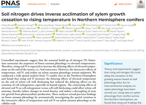 Title: Soil nitrogen drives inverse acclimation of xylem growth cessation to rising temperature in Northern Hemisphere conifers Yaling Zhang, Jian-Guo Huang, Minhuang Wang, Wenjin Wang, Feiyu Yang, Annie Deslauriers, Patrick Fonti, Eryuan Liang, Harri Mäkinen, Walter Oberhuber, et al.Abstract Controlled experiments suggest that the seasonal build-up of nitrogen (N) limitation ...